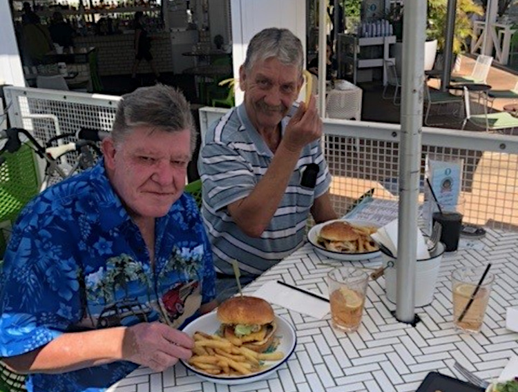 Story by Kathy Bryant, Service Manager, Wamuran Park Home, John pictured with mate Ray Tetley out to lunch.