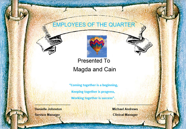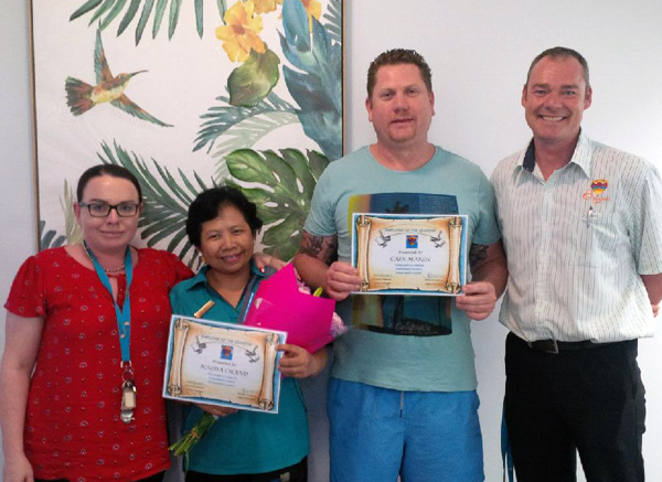Story by Linda Beaumont, Pictured Magda Shand and Cain Marsh receiving their Employee Awards. Condolence Street sign, and Michael with Danielle in their just completed feature garden with flowers, grass, fountain, and lighting.